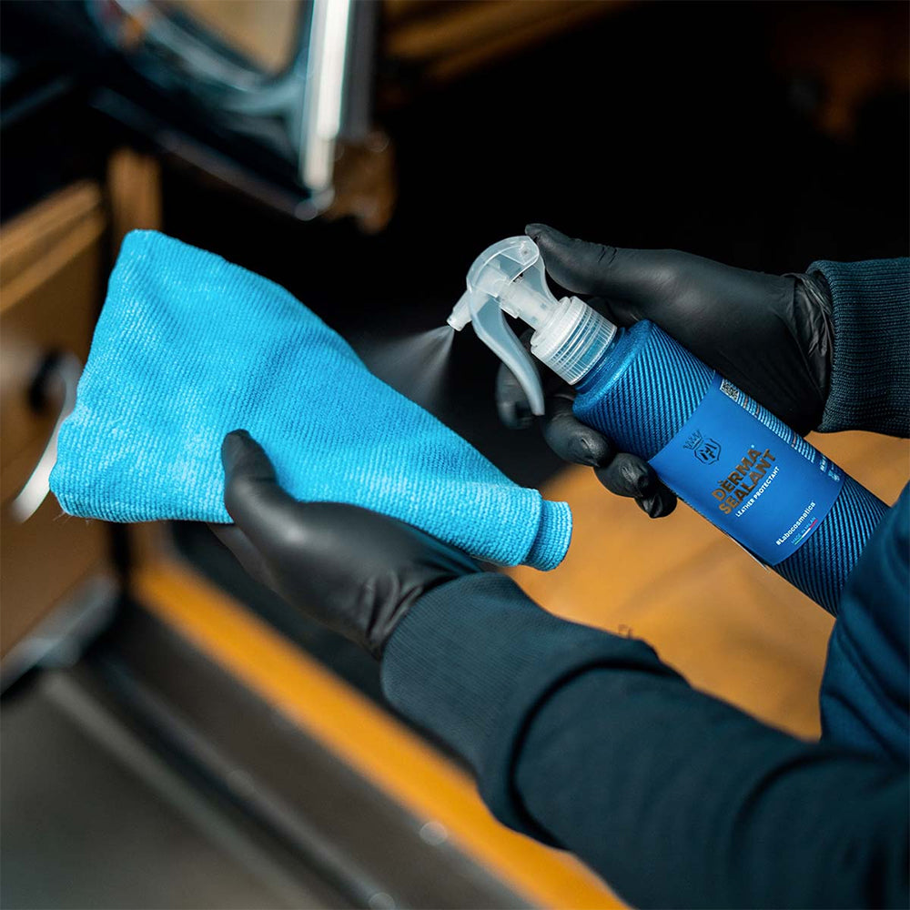 - Once the leather is cleaned and dried, apply DERMA SEALANT to a soft microfibre pad
