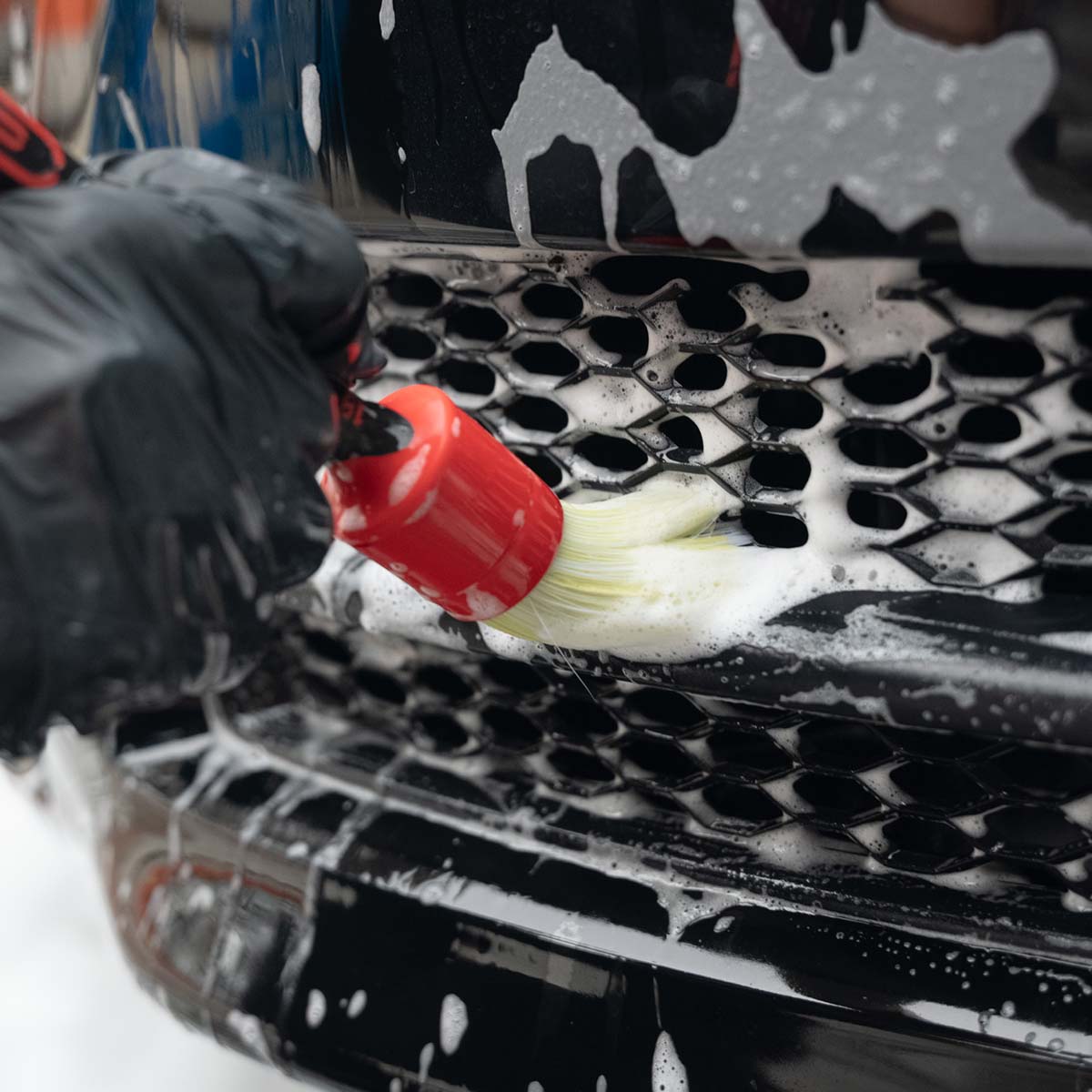 Once the foam has been applied, proceed with the manual washing, delicately passing a microfibre glove directly over the foam. Thanks to the soft and enveloping consistency of the foam, this technique minimises direct contact between the glove and the paintwork, acting as a real cushion that prevents any accidental scratches. This method is particularly suitable for those who want to obtain a deep and safe cleaning, maintaining the integrity and shine of the bodywork without risking damaging it.