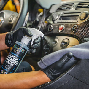 Spray Interior Cleaner Purifier directly and evenly on the surface to be treated and wipe it off with a dry and clean microfibre cloth. In the presence of medium or heavily anchored dirt, spray evenly on the surface and work it with a soft bristle brush until foam is formed. Finally, wipe it off with a soft, damp microfibre cloth for removing the product and finally dry the surface with a second clean, dry microfibre cloth.