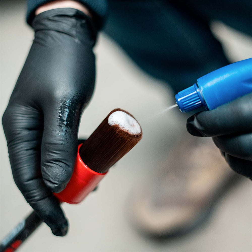 - Spray DERMA CLEANER directly on the surface or onto a leather brush
